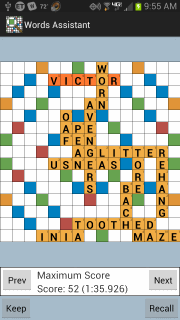 Words Assistant will help you find the best words to make from your tiles, so you don't need to rely on vocabulary and memory anymore. Words Assistant is easy to use. You simply drag and drop your opponent's tiles to the game board. Drag and drop your tiles to your tray. Then click "Find Best", and Words Assistant will find the high scoring word and also the longest word you can play with your tiles.